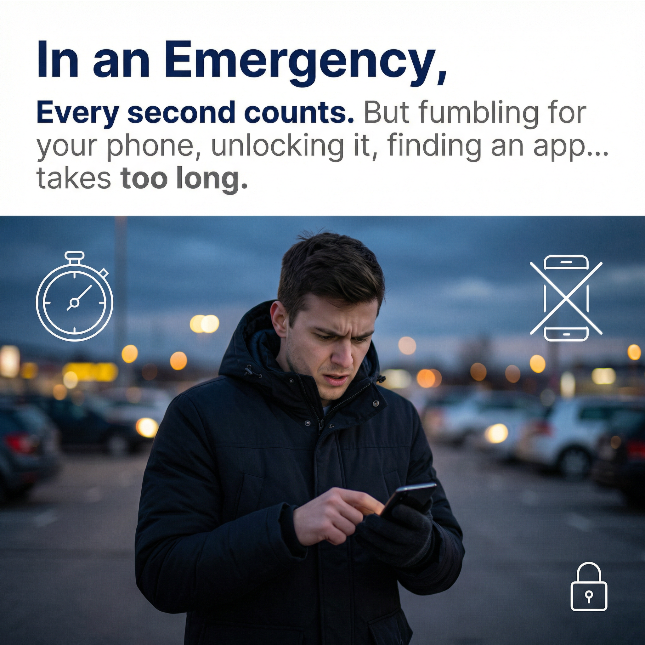 Here's the problem. In a high-stress moment—when adrenaline is pumping and the mind is racing, fine motor skills disappear. Unlocking a phone, finding an app, typing a message, or calling becomes nearly impossible.