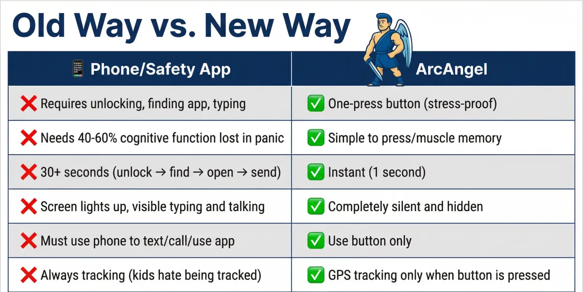 Introducing ArcAngel: The silent alert button that sends an SOS text + GPS location to you when they need help. No phone. No fumbling. No delay.